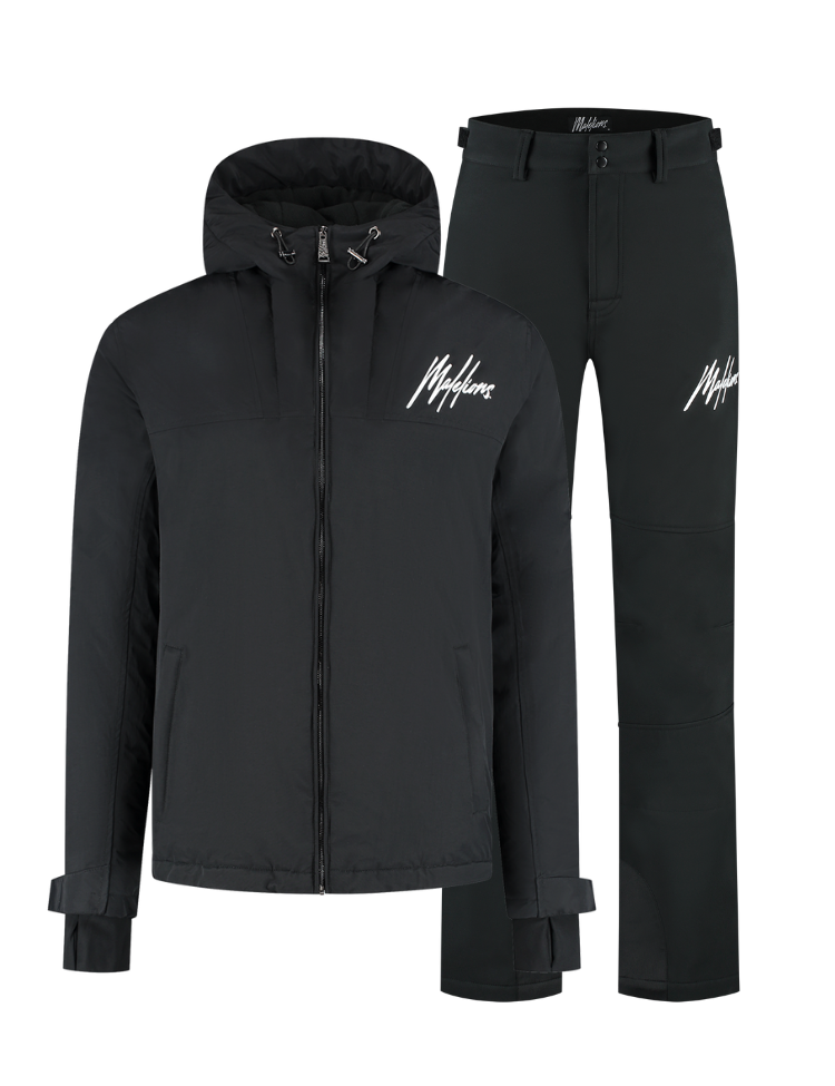 Deze stoere zwarte ski-set bestaat uit een technische jas met capuchon en bijpassende skibroek. De winterjas is voorzien van een doorlopende ritssluiting, verstelbare capuchon met koorden en het kenmerkende Malelions logo op de borst. Het jack heeft elastische boorden bij de polsen voor optimale afsluiting tegen kou en sneeuw. De bijpassende skibroek heeft een tailleband met knoop- en ritssluiting, steekzakken aan de zijkant en dezelfde witte Malelions branding op het bovenbeen. Beide items zijn uitgevoerd in een matte zwarte kleur die je moeiteloos combineert met je favoriete wintersportaccessoires.