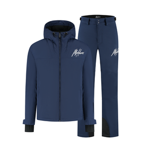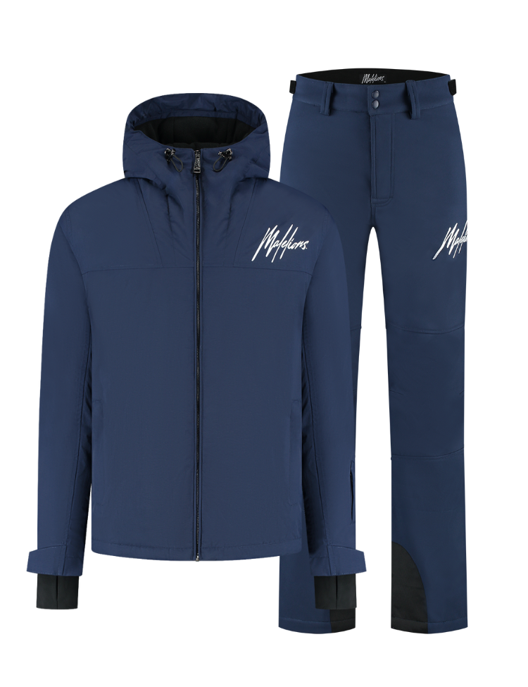 Deze complete skiset bestaat uit een waterafstotende ski-jas met vaste capuchon en bijpassende skibroek in donkerblauw. De jas heeft een doorlopende ritssluiting, twee steekzakken met ritsen en verstelbare manchetten met klittenband. Op de linkerborst staat het kenmerkende Malelions-logo in witte letters. De skibroek is voorzien van een drukknoopsluiting met ritssluiting en meerdere zakken met ritsen. Beide kledingstukken hebben zwarte contrasterende details bij de manchetten en broekspijpen voor extra bescherming.