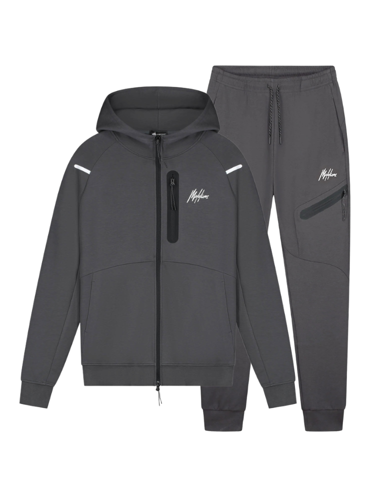 Dit sportieve trainingspak van Malelions combineert functionaliteit met style. De hoodie heeft een doorlopende ritssluiting, capuchon en een borstzak met rits aan de linkerzijde. Reflecterende details op de schouders zorgen voor zichtbaarheid. Het Malelions logo siert subtiel de borst. De bijpassende joggingbroek heeft een elastische tailleband met trekkoord, twee steekzakken en een diagonale ritszak op het bovenbeen. Het setje in antraciet is gemaakt van comfortabel sweatmateriaal dat je bewegingsvrijheid geeft tijdens je workout of casual momenten.