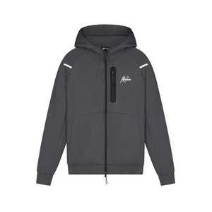 Deze antracietgrijze hoodie met doorlopende ritssluiting kenmerkt zich door sportieve details en een moderne snit. De capuchon biedt extra comfort, terwijl de reflecterende accenten op de schouders zorgen voor een opvallend detail. Op de linkerzijde van de borst is een verticale borstzak met ritssluiting zichtbaar, voorzien van het kenmerkende Malelions logo in wit. De hoodie heeft twee steekzakken aan de voorzijde en elastische boorden bij de mouwen en zoom voor een goede pasvorm.