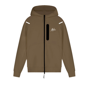 Deze sportieve hoodie combineert comfort met een stoere uitstraling. Het desert khaki vest heeft een doorlopende ritssluiting met contrasterende zwarte details en een ruime capuchon voor extra bescherming. De reflecterende strepen op de schouders zorgen voor zichtbaarheid en geven je outfit een technische touch. Twee steekzakken aan de voorzijde bieden praktische opbergruimte. De signature Malelions branding op de borst maakt het design compleet. Ribboorden bij de mouwen en zoom zorgen voor een perfecte pasvorm.