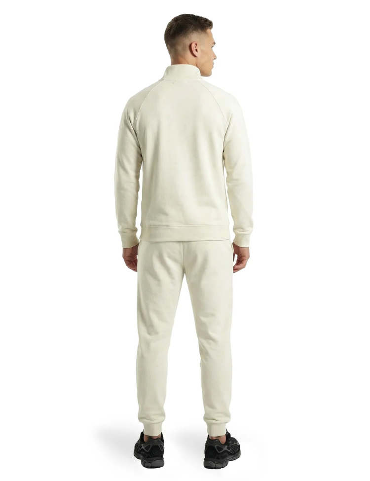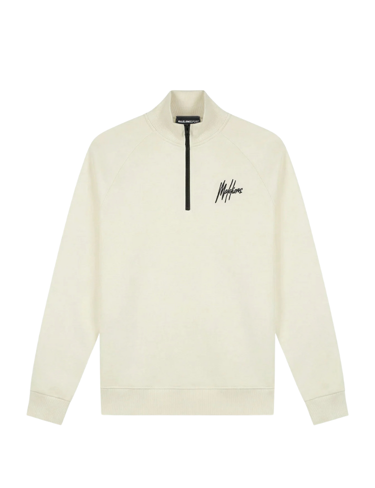 Deze off-white sweater kenmerkt zich door raglanmouwen die vanaf de hals naar de armen lopen. De opstaande kraag met halve ritssluiting in zwart contrasteert stijlvol tegen het lichte materiaal. Op de linkerborst staat het kenmerkende Malelions logo geprint. Het sportieve ontwerp wordt versterkt door de geribde boorden aan de mouwen en zoom, wat zorgt voor een comfortabele pasvorm. De zachte stof voelt prettig aan tijdens het dragen.
