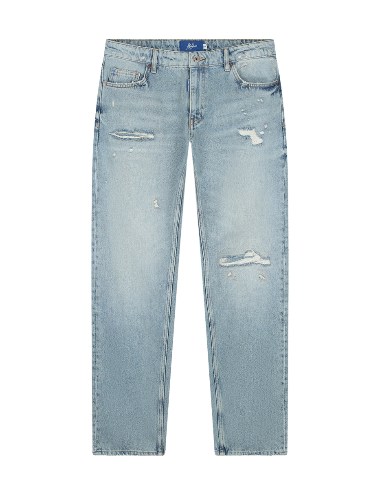 Deze lichtblauwe jeans van Malelions combineert stoere details met een relaxte straight fit. De spijkerbroek heeft opvallende distressed effecten en scheuren die je look direct karakter geven. Vijf zakken bieden praktische opbergruimte, terwijl de knoopsluiting met rits zorgt voor een klassieke afwerking. Het blauwe label op de achterzijde geeft deze denim broek zijn herkenbare Malelions touch. De lichte wassing maakt dit exemplaar veelzijdig te stylen voor verschillende occasions.