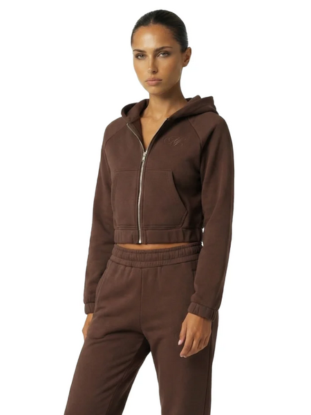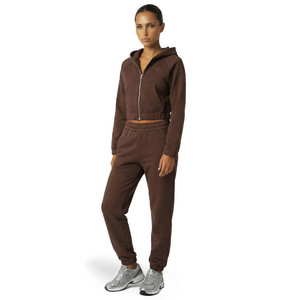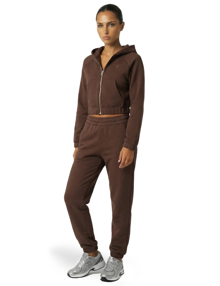 Deze chocoladebruine trainingset bestaat uit een cropped hoodie met doorlopende ritssluiting en bijpassende joggingbroek. Het vest heeft een capuchon, lange mouwen en elastische boorden bij de zoom voor een goede pasvorm. De broek kenmerkt zich door een elastische tailleband en taps toelopende pijpen met boorden aan de enkels. Beide delen zijn uitgevoerd in een zachte sweatstof die comfort en bewegingsvrijheid biedt. Het subtiele emblem logo geeft deze tweedelige set een herkenbare touch.