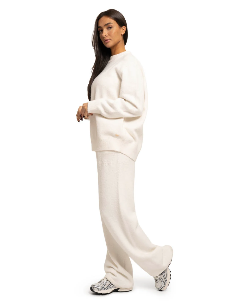 Deze crèmekleurige gebreide broek voor dames combineert comfort met stijl. Het zachte breisel voelt lekker aan op je huid en zorgt voor bewegingsvrijheid. De elastische tailleband met koord geeft je de perfecte pasvorm. Door het rechte, wijde model valt de broek soepel langs je benen. De ribgebreide textuur geeft deze joggingbroek een luxe uitstraling die je zowel sportief als casual kunt dragen.