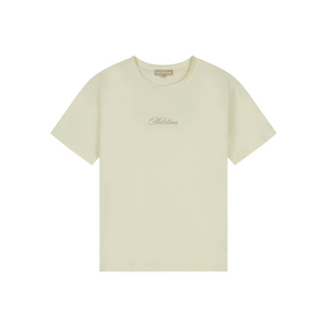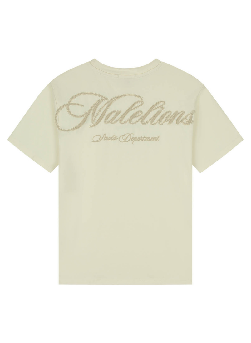 Dit crèmekleurige dames T-shirt van Malelions combineert sportieve elegantie met streetwear attitude. Het shirt heeft een relaxed fit met korte mouwen en ronde halslijn. Op de voorzijde prijkt een subtiele tonal Malelions-branding op borsthoogte. De achterkant toont een groot script logo met de tekst "Malelions Studio Department" in bijpassende tint. Het zachte materiaal zorgt voor draagcomfort tijdens je dagelijkse activiteiten. Perfect voor wie houdt van understated luxe met een vleugje streetwise karakter.