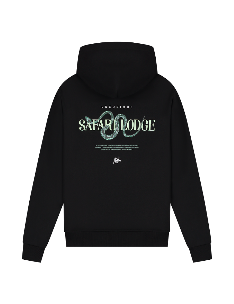 Deze zwarte dames hoodie van Malelions combineert sportieve comfort met hedendaagse streetwear stijl. De sweater heeft een ruime capuchon en lange mouwen met geribde boorden voor optimale pasvorm. Op de achterkant prijkt een opvallende Safari Lodge print met slangendesign en tekstdetails, terwijl de voorzijde het Malelions logo op de borst toont. De kangoeroezak biedt praktische opbergruimte en houdt je handen warm. Deze trui met capuchon is uitgevoerd in een relaxte pasvorm die perfect aansluit bij een actieve lifestyle.