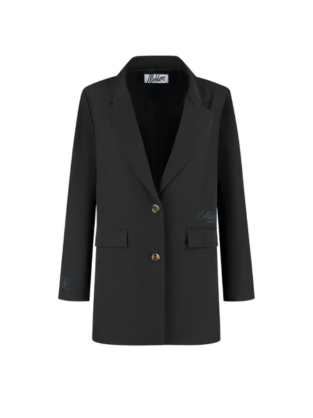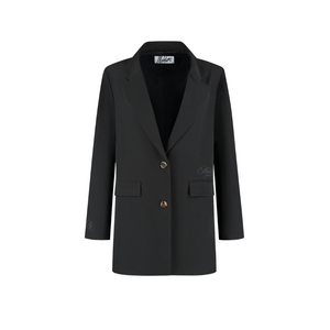 Deze oversized dames blazer van Malelions combineert streetwear met zakelijke stijl. Het zwarte colbert heeft een klassieke revers en twee goudkleurige knopen voor een luxe uitstraling. De ruime pasvorm zorgt voor comfort terwijl je er stijlvol uitziet. Twee opgestikte zakken aan de voorkant bieden functionaliteit. Subtiele Malelions branding siert de rechterzak en mouw voor herkenbare details. De lange mouwen met knopen bij de manchetten geven je outfit net dat extra accent.