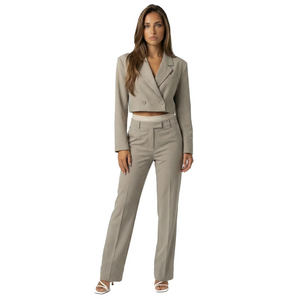 Deze stijlvolle combi-set voor dames bestaat uit een cropped blazer en bijpassende pantalon in zandkleur met subtiel krijtstreeppatroon. De blazer heeft een dubbele knoopsluiting, klassieke revers en lange mouwen. Het korte model stopt net boven de taille voor een trendy silhouet. De pantalon heeft een hoge taille met riemlussen en straight fit pijpen. Het fijne krijtstreepdessin geeft deze tweedelige set een zakelijke twist met moderne edge.