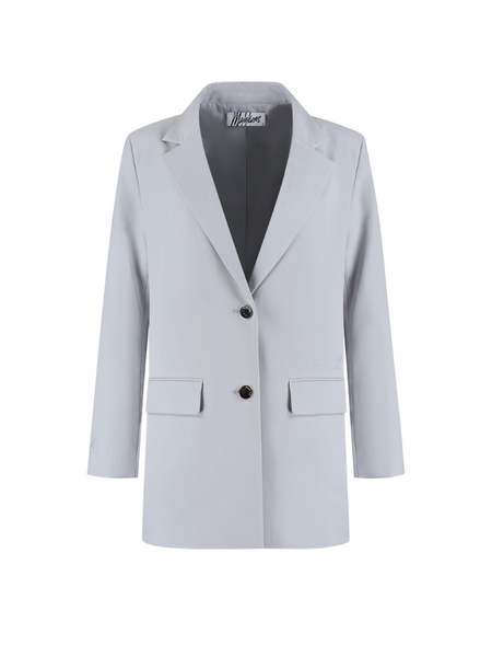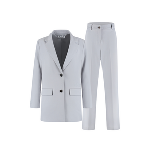Deze lichtgrijze combi-set bestaat uit een getailleerde blazer en bijpassende pantalon. De blazer heeft een klassieke revers, twee-knoopssluiting en steekzakken aan de voorzijde. De pantalon valt recht en heeft een hoge taille met plooien voor extra comfort. Het Malelions-logo siert subtiel de binnenzijde. Perfect voor je zakelijke meetings of wanneer je stijlvol voor de dag wilt komen. De zachte grijze tint maakt deze set veelzijdig en tijdloos.