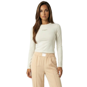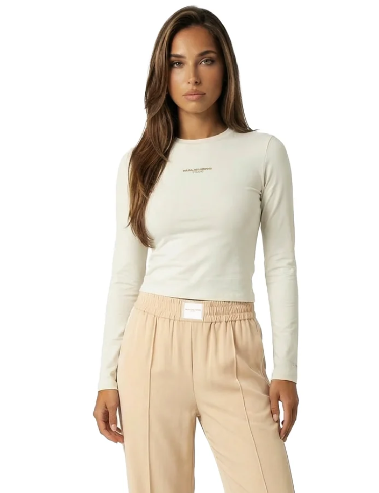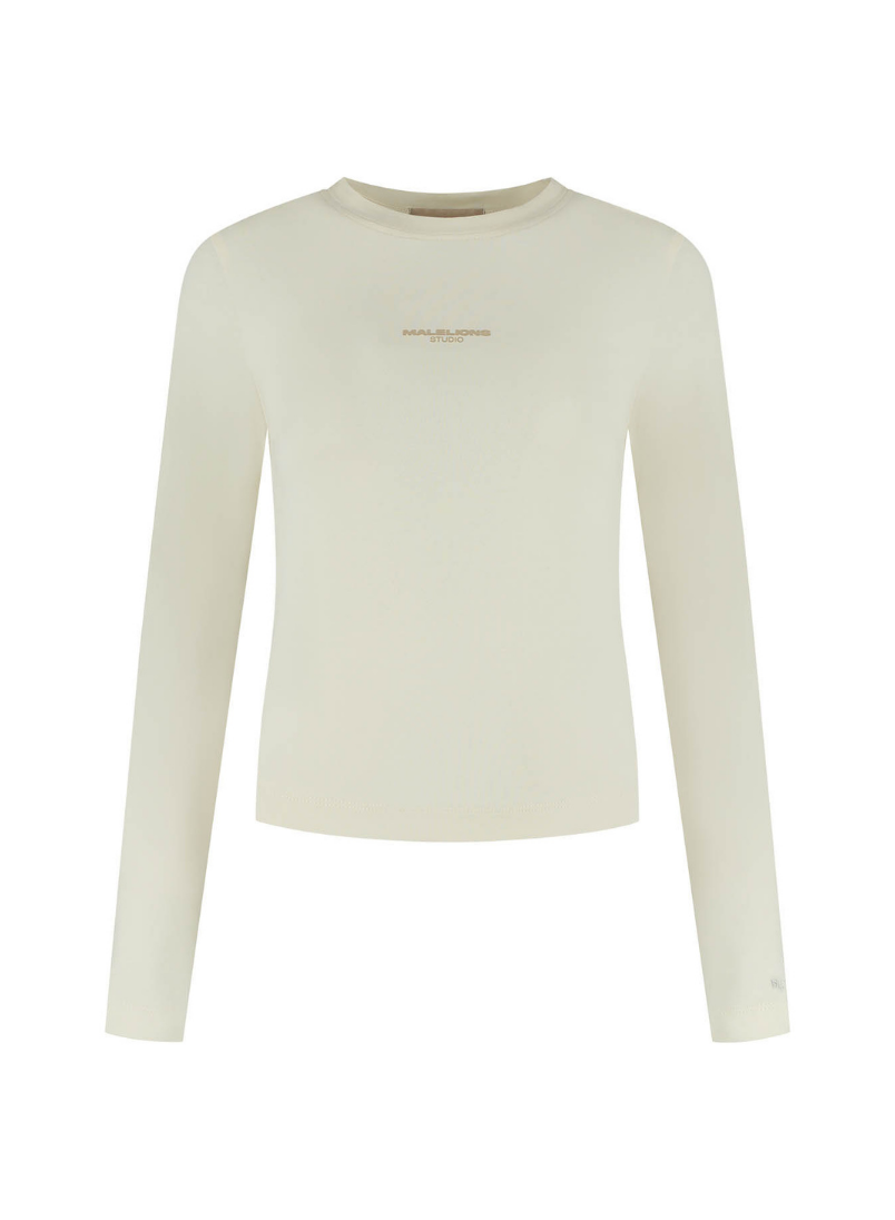 Deze crème longsleeve top voor dames kenmerkt zich door een nauwsluitende pasvorm en lange mouwen. Het shirt heeft een ronde halslijn en valt kort op de taille voor een moderne cropped look. Op de voorzijde staat een subtiele tekstprint met "Malelions Studio" in gouden letters centraal op de borst. Het gladde materiaal zorgt voor een strakke, sportieve uitstraling die perfect aansluit bij je actieve lifestyle.