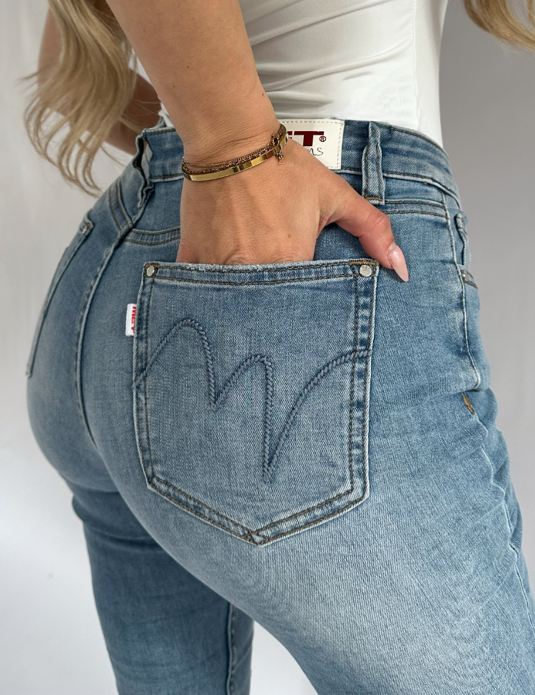 De MET Jeans Kate 1l503 in een middenblauwe wassing, damaged details met aangesloten pasvorm en stretch. De broek heeft het kenmerkende logo op de achterzak.