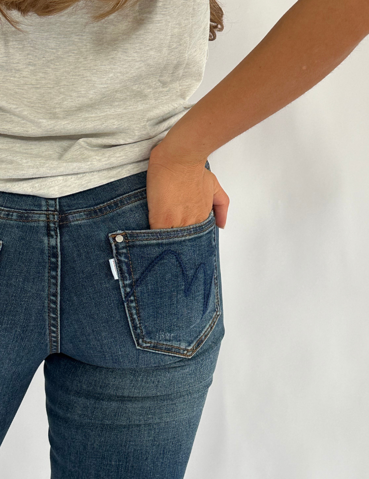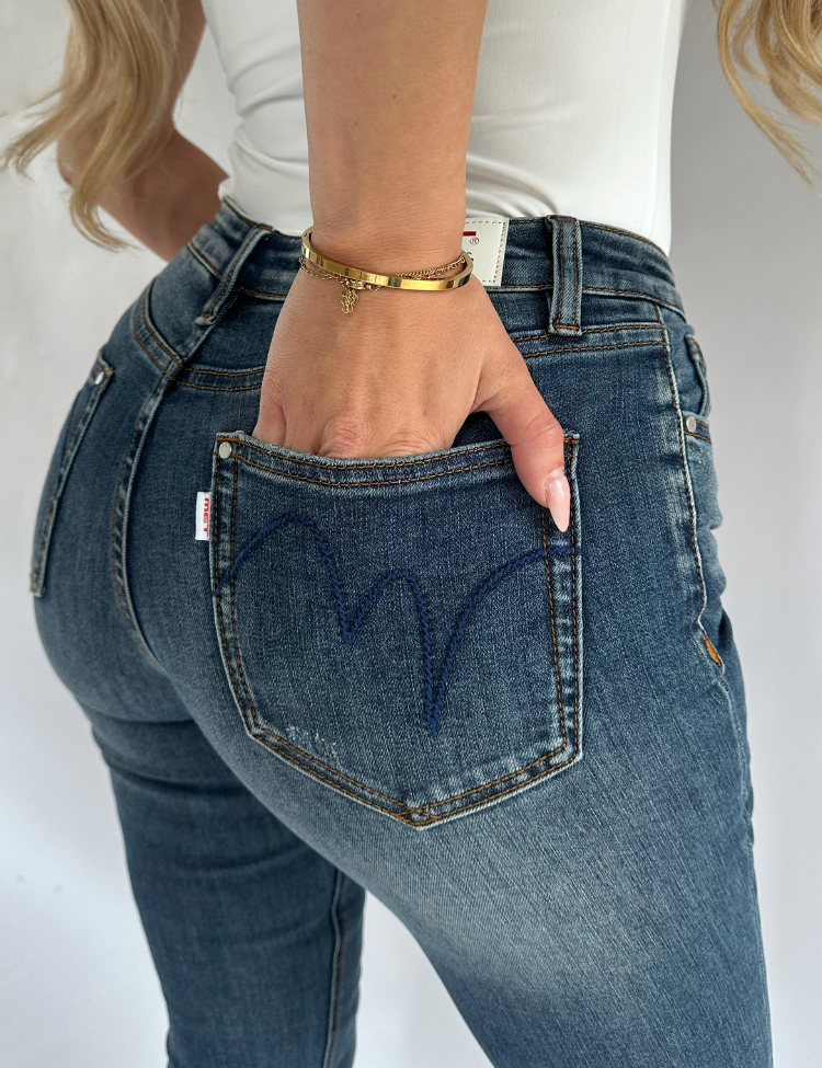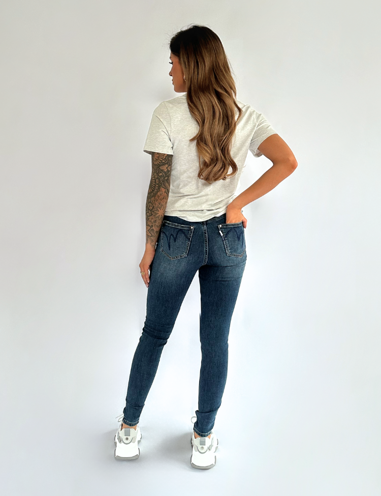 De MET Jeans Kate 1L551 in een blauwe wassing met damaged details, normale taille, aangesloten pasvorm en stretch. De broek heeft het kenmerkende logo op de achterzak.
