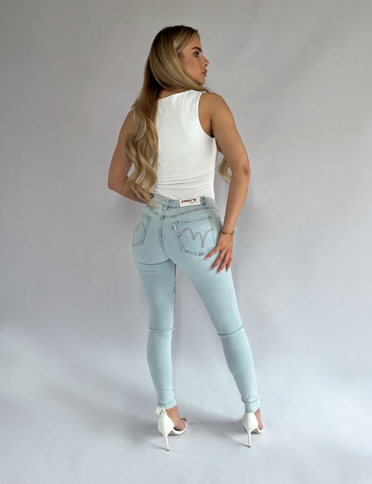 De Kate T1L708 is de perfecte skinny jeans voor een frisse, zomerse look. Met een high waist en superstretch pasvorm sluit deze jeans mooi aan van taille tot enkel, en accentueert het vrouwelijk silhouet. De lichte denimwash geeft een cleane en luchtige uitstraling, terwijl het iconische “M”-stiksel op de achterzakken zorgt voor een herkenbare en trendy finish.