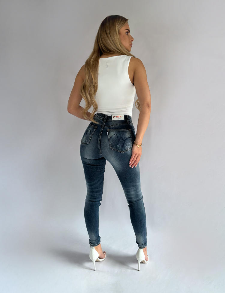 De Kate T1L708 is een skinny jeans met een moderne, vrouwelijke pasvorm in een diep donkerblauwe wassing. De subtiele faded details en verfspatten zorgen voor een edgy twist, terwijl de high waist en comfortabele stretchstof een flatterend silhouet creëren. Het iconische “M”-borduursel op de achterzakken maakt de look compleet.