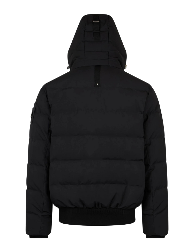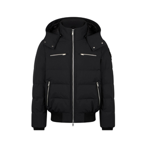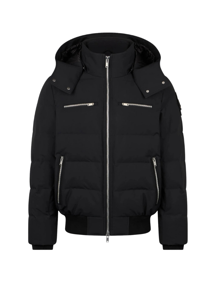 Deze zwarte bomberjack van Moose Knuckles combineert een strak silhouet met warme gewatteerde vulling. Het jack heeft een afneembare capuchon met verstelbare trekkoorden en klittenbandsluiting. De voorzijde sluit met een tweeweg ritssluiting en heeft vier ritssluitingen: twee borstzakken met schuine zakken en twee insteekzakken aan de zijkant. Alle ritsen zijn uitgevoerd in zilverkleurig metaal. Het elastische boordstuk aan de zoom en manchetten zorgt voor een comfortabele pasvorm. Op de linkermouw zit een opgestikt logopatch. De gewatteerde buitenstof heeft een matte afwerking.