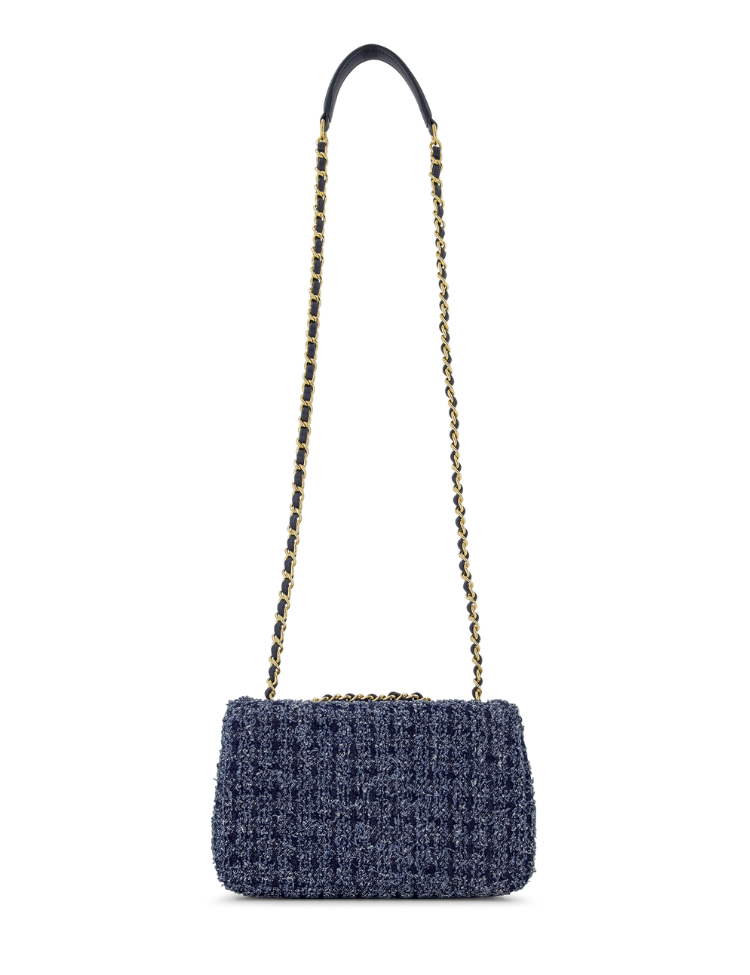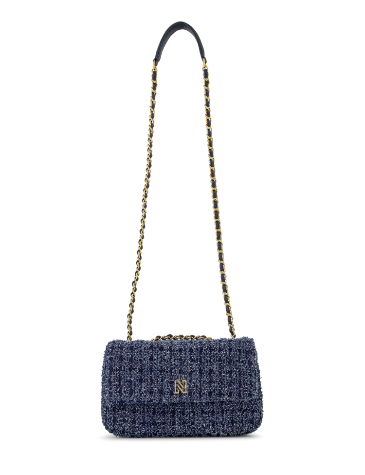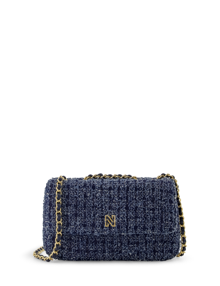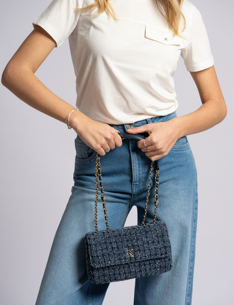 De Nikkie Ann Denim Shoulderbag is hét statementaccessoire voor fashion lovers die houden van een mix tussen klassiek en edgy. Deze compacte schoudertas is uitgevoerd in een luxueuze boucléstof met rijke textuur en voorzien van een kettinghengsel met leerdetails voor een vleugje glamour. De goudkleurige N-hardware op de klep zorgt voor een verfijnde finishing touch.