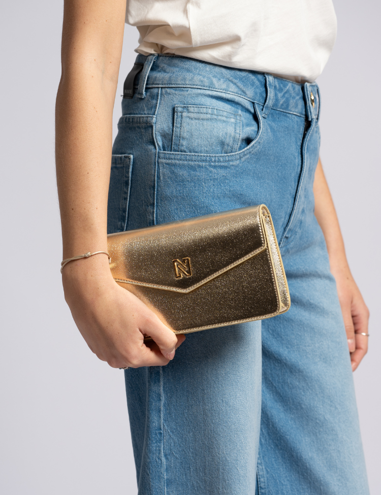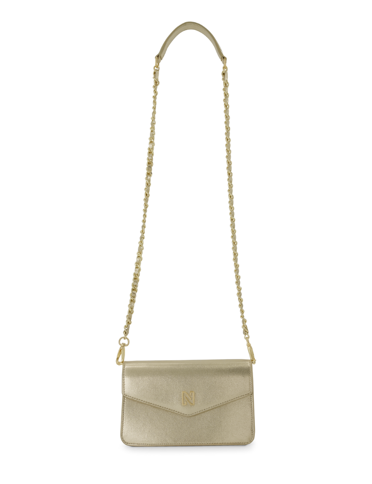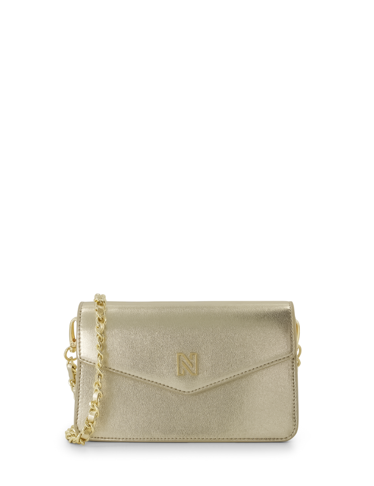 Maak een stijlvol statement met de Nikkie Daxing Gold Shoulderbag, een compacte schoudertas met maximale impact. Het strakke silhouet wordt versterkt door de luxueuze metallic afwerking, de goudkleurige kettingriem en het subtiele metalen logo op de voorflap. De elegante envelopvorm en stevige structuur maken deze tas zowel trendy als functioneel.