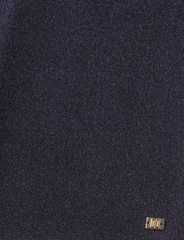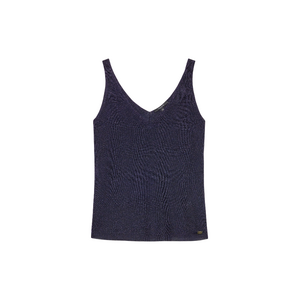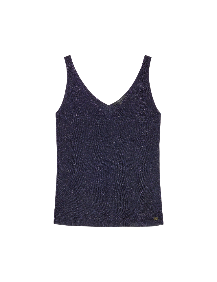 Deze donkerblauwe top van Nikkie heeft een diepe V-hals en brede schouderbanden. De fijngebreide stof heeft een subtiele glans door metallic accenten, waardoor het item een verfijnde uitstraling krijgt. Aan de onderrand zie je een goudkleurig merkplaatje. Het singlet valt net over de heup en heeft een aansluitende pasvorm die het silhouet mooi volgt. De zachte jersey structuur biedt voldoende stretch voor het draagcomfort.