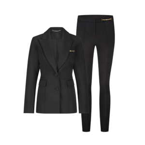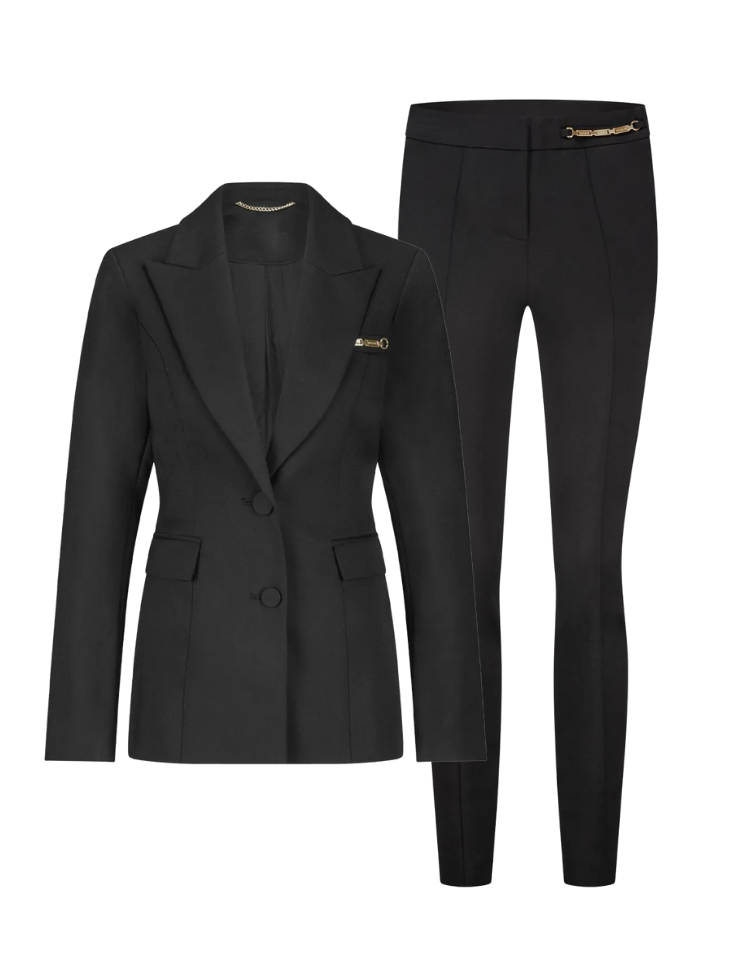 Stap stijlvol en zelfverzekerd voor de dag in de Nikkie Kallin Combi-set in het zwart. Deze krachtige set bestaat uit een vrouwelijke blazer met tailored fit en chique gouden pin-detail op de borstzak, gecombineerd met de strakke high-waist pantalon met hetzelfde luxe detail op de tailleband. Een perfecte outfit voor een business meeting, diner of fashion moment – minimalistisch, classy en krachtig.