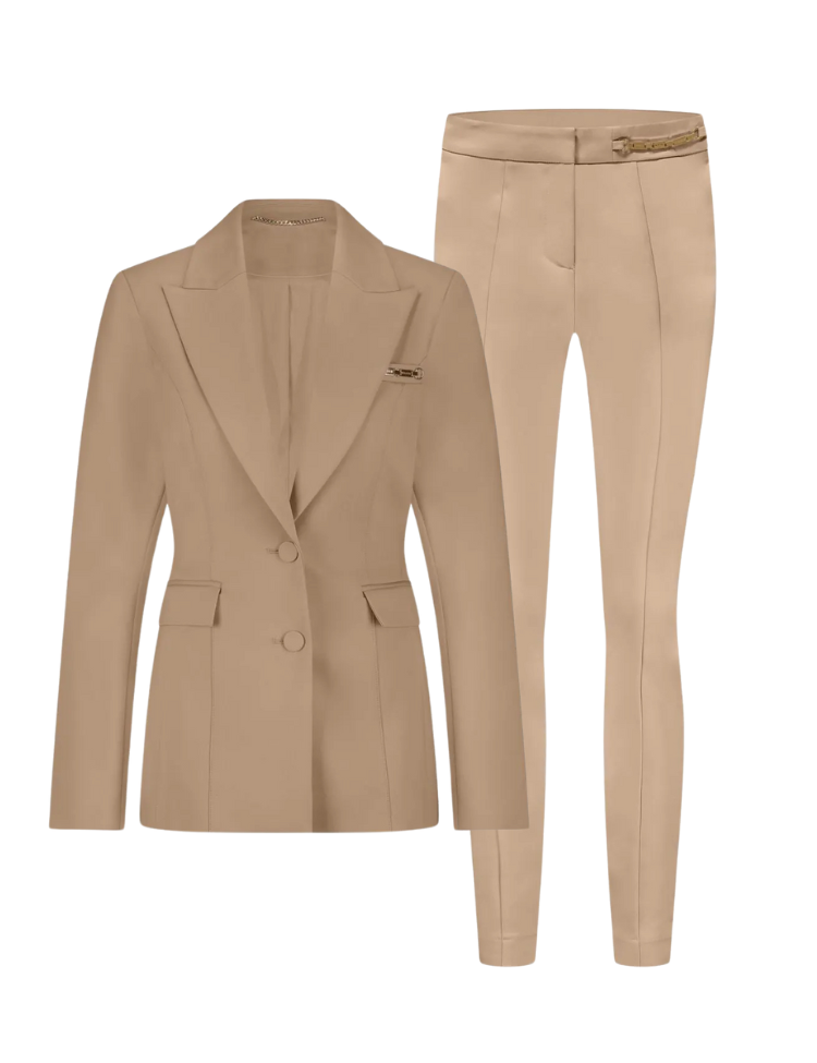 De Nikkie Kallin Combi-set in de kleur Dust straalt pure power uit. Deze set bestaat uit een perfect getailleerde blazer met gouden detail op de borst en een bijpassende skinny pantalon met hetzelfde stijlvolle accent op de tailleband. De combinatie van een vrouwelijke pasvorm en een classy beige tint maakt dit een musthave look voor kantoor, diner of event.
