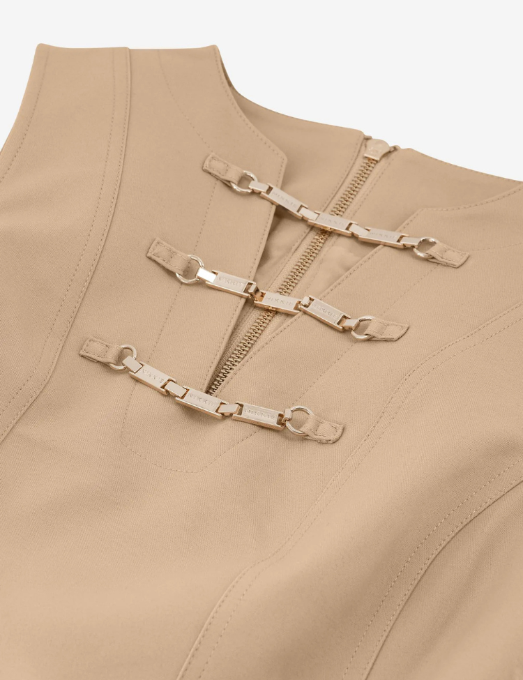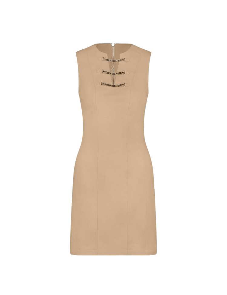 De Nikkie Kallin Dress in de kleur Dust is een verfijnde eyecatcher met een edgy twist. Deze mouwloze jurk heeft een strakke pasvorm en is afgewerkt met drie stijlvolle gouden chain-details op de borst. Perfect voor een zakelijke gelegenheid, een diner of een fashionable feestje. Met deze jurk ben jij klaar om indruk te maken.