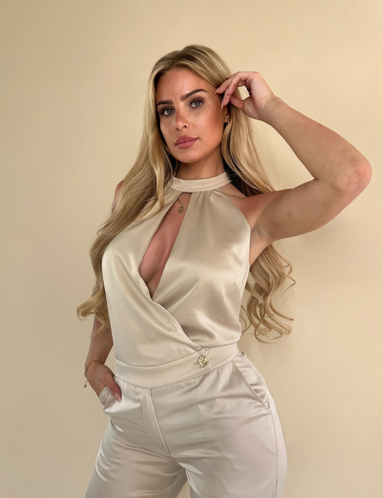 Maak een statement met de elegante Nikkie Kansis Jumpsuit – Dust. Deze sophisticated jumpsuit straalt pure klasse uit door de hoge halternek met striksluiting aan de achterkant, de subtiele plooiing aan de voorzijde en de flatterende, rechtvallende broekspijpen. De soepele stof valt prachtig om het lichaam en de verfijnde tailleband met goudkleurige knoopdetail voegt een luxueuze touch toe.
