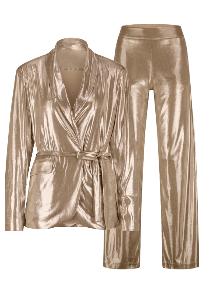De Nikkie Kennet Combi-set in Gold is de ultieme statement outfit voor vrouwen die willen schitteren. Deze co-ord set bestaat uit een metallic wrap blazer met bijpassende high-waisted wide-leg broek. De blazer heeft een flatterende tailleriem en elegante revers, terwijl de soepelvallende broek zorgt voor een krachtig silhouet met glamoureuze flair.
