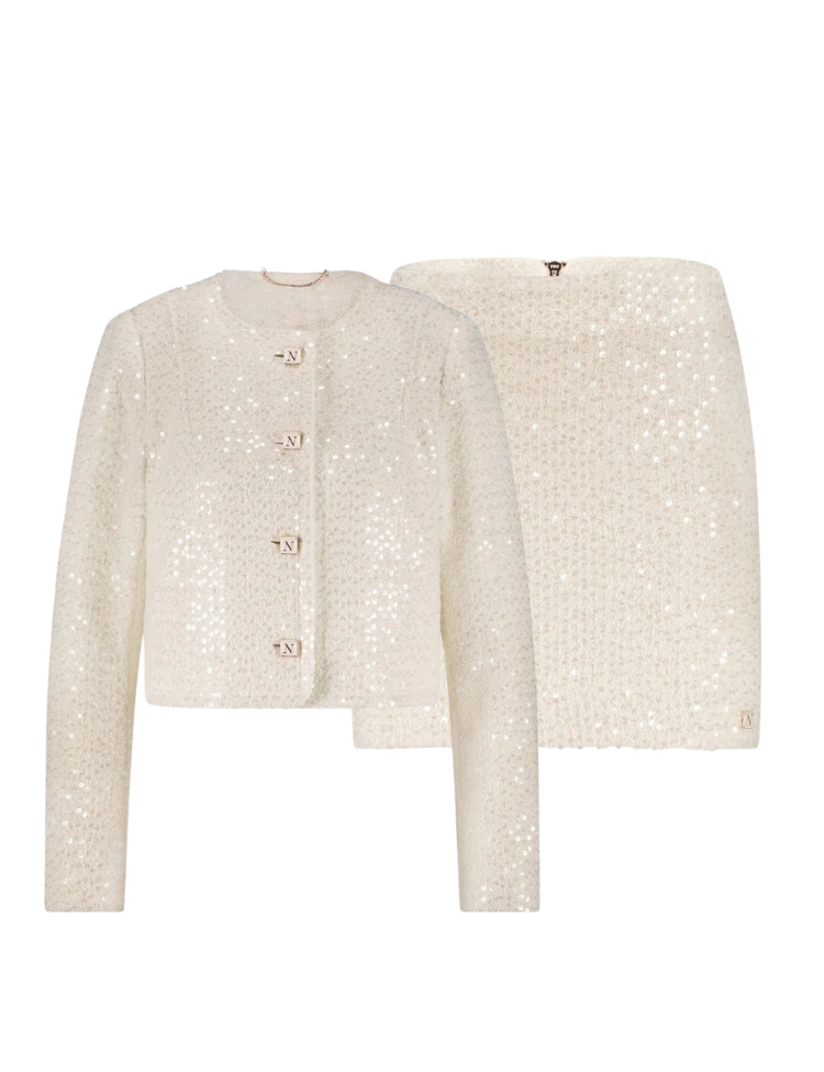 De Nikkie Kent Combi-set in Cream is de ultieme combinatie van elegantie en glamour. Deze set bestaat uit de glinsterende Kent Jacket en bijpassende Kent Skirt, beide uitgevoerd in een luxe bouclé-stof met verfijnde pailletten. De cropped blazer sluit stijlvol met N-logo knopen en heeft een chique ronde halslijn, terwijl de high-waisted mini skirt je silhouet perfect accentueert. Samen vormen ze een verfijnde co-ord look die perfect is voor feestjes, diners of elke gelegenheid waar je wilt schitteren. Combineer met hakken en een minimalistische clutch en je bent klaar om indruk te maken.