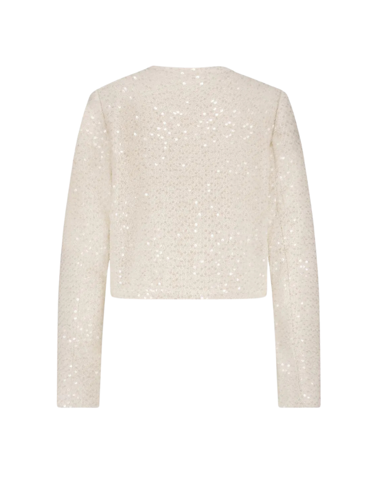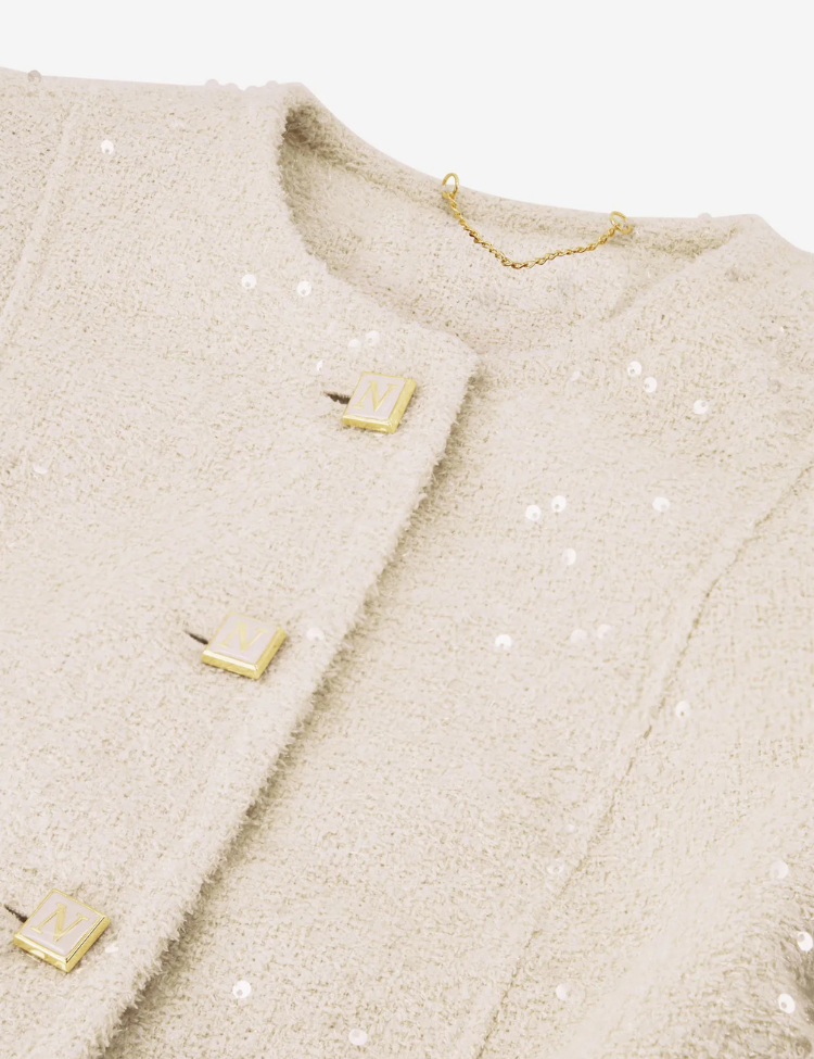 Het Nikkie Kent Jacket in Cream is een ware eyecatcher voor de fashionista die houdt van elegantie met een sprankelende twist. Dit cropped jasje is rijkelijk versierd met subtiele pailletten die een glamoureuze glans geven aan je look. De ronde hals en rechte pasvorm geven het jasje een klassieke uitstraling, terwijl de opvallende ‘N’-knopen aan de voorkant zorgen voor een moderne en luxe finish. Perfect voor feestelijke gelegenheden of als stijlvolle upgrade op een casual outfit. Combineer met een high-waisted pantalon of matching skirt voor een sophisticated ensemble.