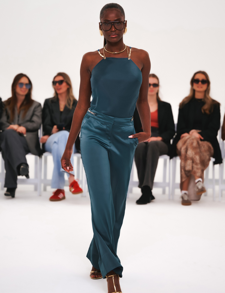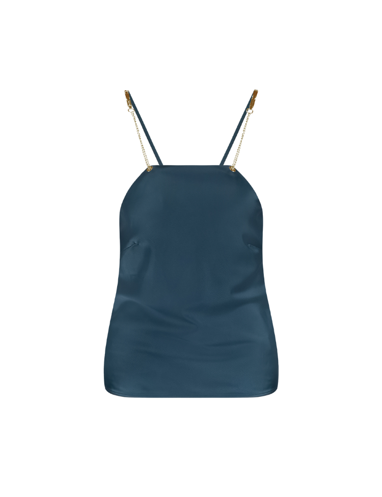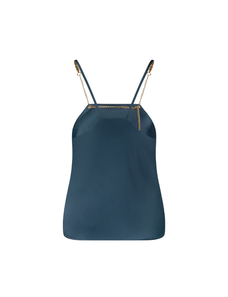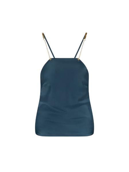 De Nikkie Kenya Top in Teal Blue is een chique en vrouwelijke top die elegantie ademt. Deze satijnlook top is vervaardigd uit een glanzende, soepele stof die prachtig langs het lichaam valt. De rechte halslijn met fijne goudkleurige chain-bandjes zorgt voor een luxe, verfijnde uitstraling.