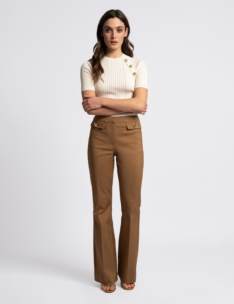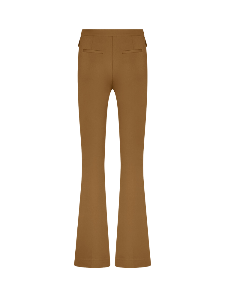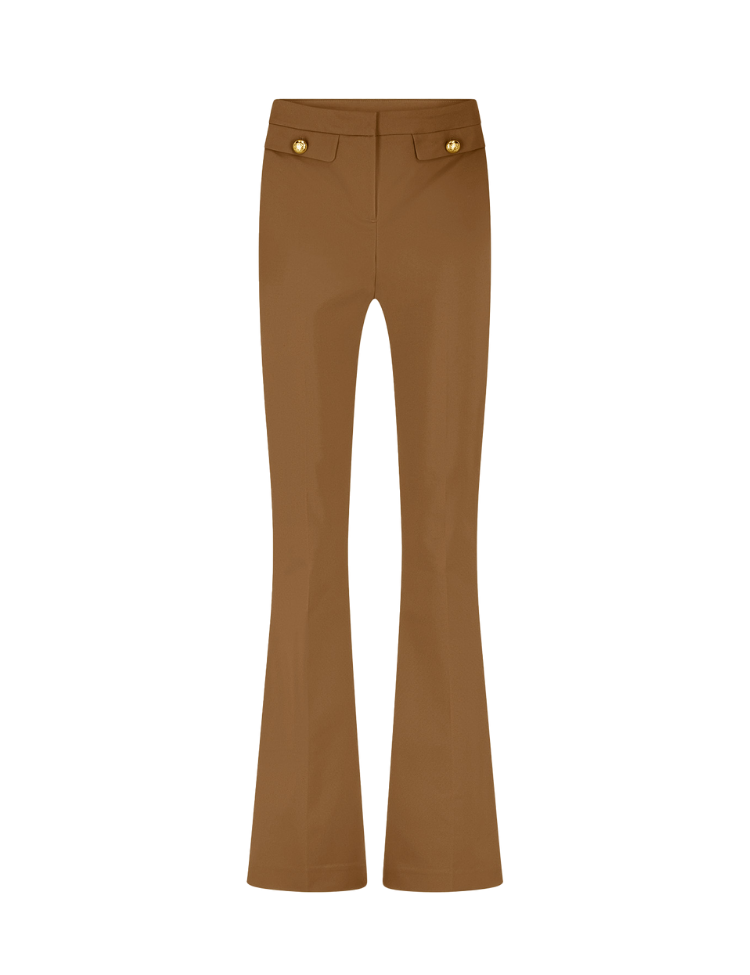 De Nikkie Lancastero Pants zijn de perfecte combinatie van elegantie en moderne flair. Deze flared pantalon met middelhoge taille creëert een lang en vrouwelijk silhouet dat zowel flatterend als tijdloos is. De uitlopende pijpen geven de broek een chique en trendy uitstraling, terwijl de klepzakken met knoopdetails zorgen voor een subtiele, luxueuze finishing touch. De ritssluiting garandeert een nette en comfortabele pasvorm, ideaal voor zowel zakelijke als casual gelegenheden.