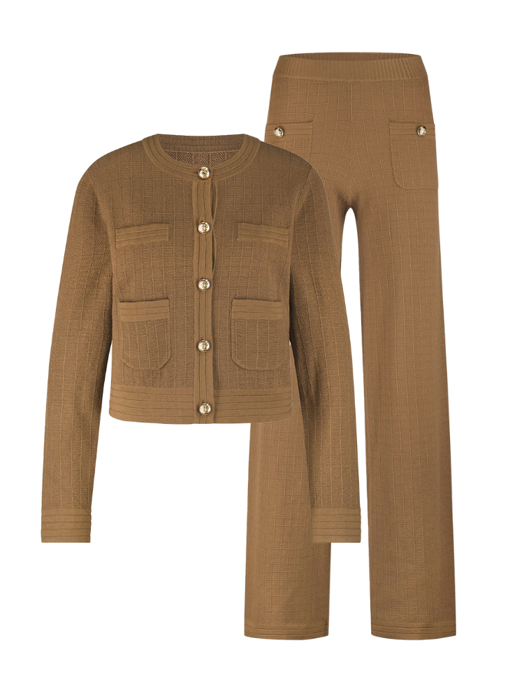 De Nikkie Limeira Combi-set combineert knitwear luxe met ultiem comfort. Het vest met ingeweven ruitstructuur, elegante knoopsluiting en ronde hals straalt verfijning uit en biedt praktische zakken voor extra gemak. De bijpassende pants met hoge taille en elastische band zorgen voor een flatterende fit en een moderne uitstraling. Samen vormen ze een stijlvolle set die je zowel casual met sneakers als chic met hakken kunt dragen.