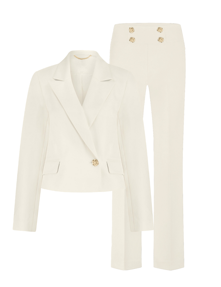 De Nikkie Lisbon Combi-set – Pearl bestaat uit een elegante blazer en bijpassende pantalon. De blazer is uitgevoerd in een getailleerd model met één goudkleurige knoop en klassieke reverskraag. De pantalon heeft een hoge taille en is afgewerkt met vier goudkleurige knopen voor een verfijnde look. De set is vervaardigd uit hoogwaardige stof die zorgt voor een luxe uitstraling en een comfortabele pasvorm. Perfect als power suit voor zakelijke gelegenheden of een stijlvolle avond uit.