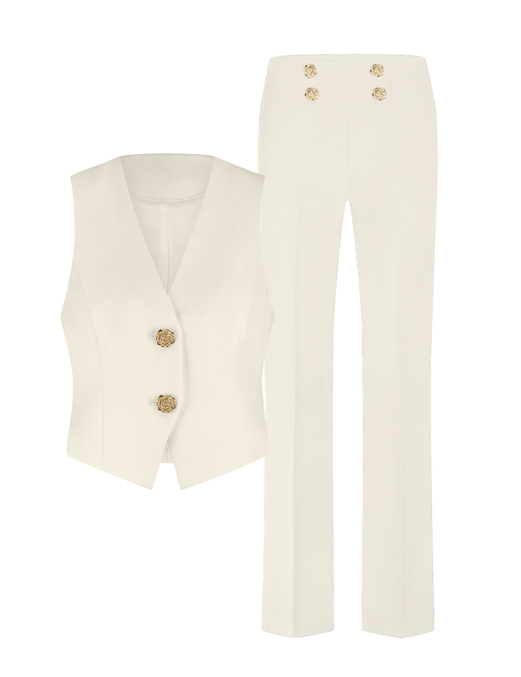 De Nikkie Waistcoat Combi-set combineert vrouwelijkheid en klasse in één stijlvolle look. Het gilet heeft een getailleerde pasvorm met luxe goudkleurige knopen en een elegante V-hals. De pantalon valt mooi recht en zorgt voor een flatterend silhouet, afgewerkt met vier gouden knopen voor een chique detail.