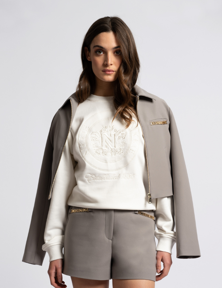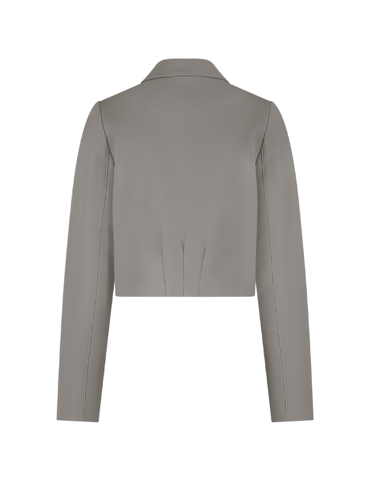 De gouden rits en het subtiele kettingdetail op de borst geven de jas een glam touch, terwijl de klassieke kraag en clean tailoring zorgen voor balans en elegantie. Dit jasje draag je zowel casual als chic – combineer het met een high-waisted pantalon voor een city look of over een jurk voor een modieuze twist.