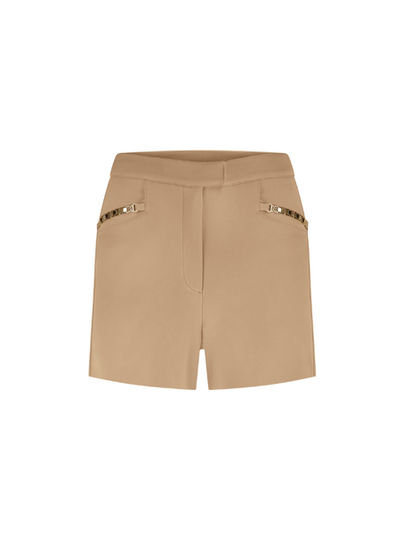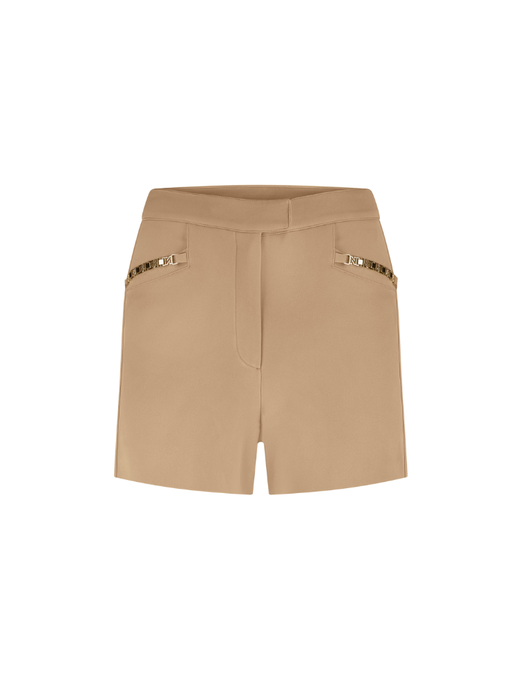 Deze tailored shorts van Nikkie combineert een verfijnde uitstraling met draagcomfort. De hazelnootkleurige stof heeft een gladde afwerking en valt soepel om je benen. Het model heeft een hoge taille met brede tailleband voor een flatterend silhouet. Opvallend detail is het goudkleurige Nikkie-logo op de achterzak. De shorts heeft steekzakken aan de voorzijde en paspelzakken aan de achterkant. Met persvouwen voor een verzorgde look. De korte broek valt net boven de knie.