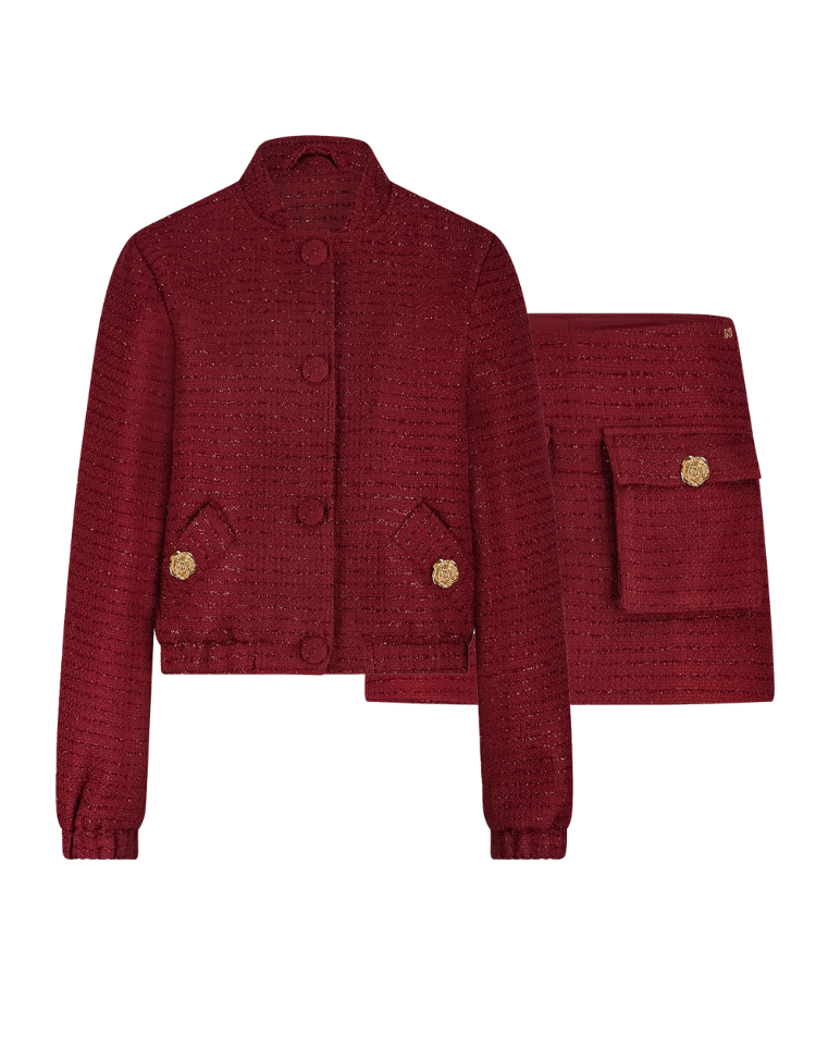 De Nikkie Loreda Combi-set straalt luxe en moderniteit uit. De skort van bouclé met subtiel glitterdraad combineert de elegantie van een rokje met het comfort van een short. De hoge taille en klepzakken met knoopdetails geven een vrouwelijke touch, terwijl de blinde ritssluiting zorgt voor een strakke afwerking. Het bijpassende bomberjack, ook uitgevoerd in bouclé met glitteraccent, heeft een oversized pasvorm, elastische tailleband en drukknoopsluiting voor een eigentijdse, nonchalante look. Samen vormen ze een statement set, maar ook afzonderlijk eindeloos te combineren met jeans, blouses of knitwear.