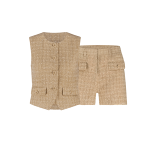 De Nikkie Lorena Combi-set straalt tijdloze klasse uit met een moderne twist. Het waistcoat is uitgevoerd in luxueuze tweed met subtiel glitterdraad, een getailleerde pasvorm en elegante details zoals klepzakken en knoopsluiting. De shorts, eveneens van tweed, heeft een middelhoge taille en een flatterend silhouet met speelse klepzakken. Samen vormen ze een sophisticated set die je zowel chic kunt stylen met hakken en een blouse als casual met sneakers en een top.