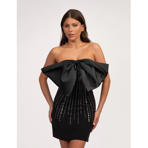 Deze opvallende zwarte jurk van Nikkie heeft een dramatische off-shoulder strik die je schouders accentueert. Het strakke silhouet wordt versierd met glinsterende kraaltjes en pailletten die in elegante lijnen vanaf de taille naar beneden vallen. De mini-lengte jurk heeft een nauwsluitende pasvorm die je figuur flatteert. Het satijnen strikdetail contrasteert prachtig met de getailleerde onderkant, wat zorgt voor een verfijnde balans tussen volume en vorm.