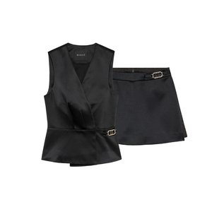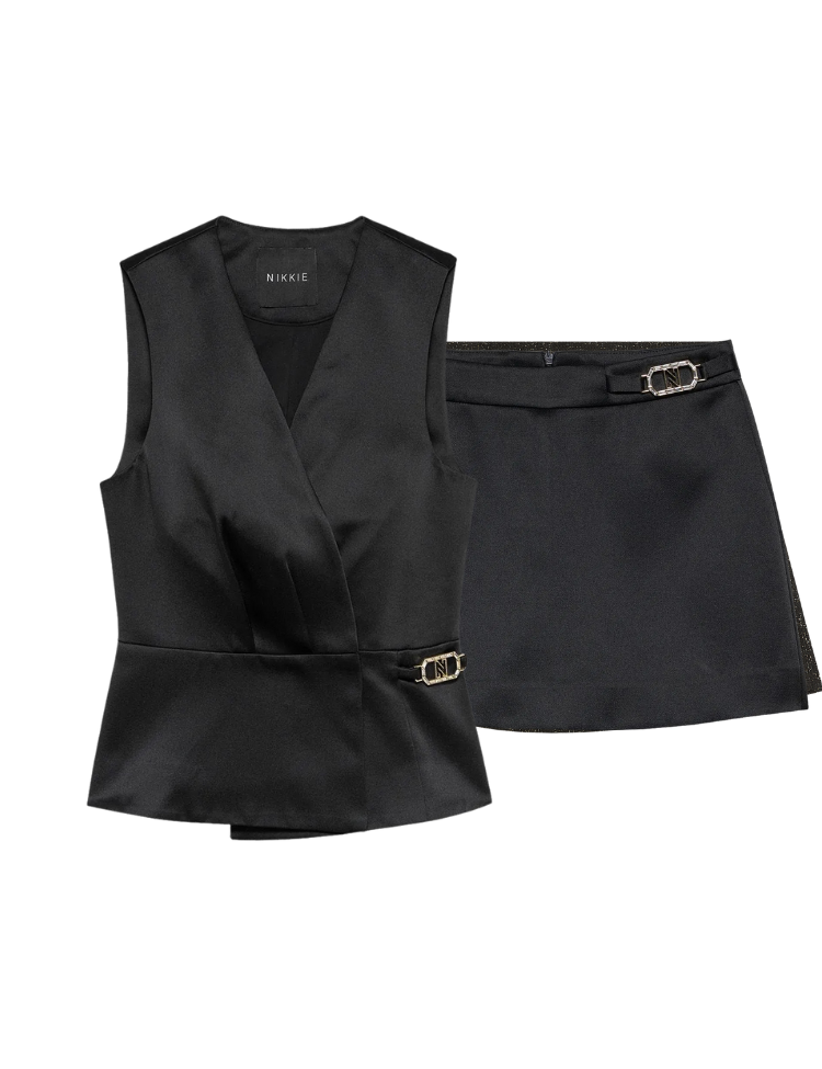 Deze elegante zwarte combi set van Nikkie bestaat uit een mouwloze top met overslag en bijpassende minirok. De top heeft een diepe V-hals met overslagdetail en wordt geaccentueerd door een decoratieve riem met goudkleurige gesp op de taille. De gladde stof heeft een subtiele satijnen glans die je outfit direct verfijnt. De bijpassende rok valt soepel om je heupen en heeft dezelfde goudkleurige gespdetails. Perfect voor een zakelijke afspraak of feestelijke gelegenheid.