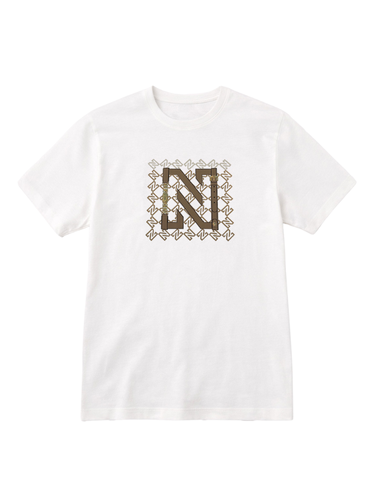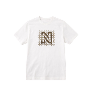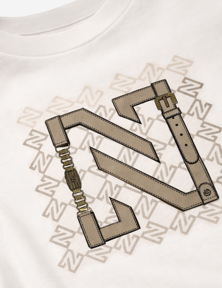 Wit katoenen shirt met opvallende frontprint in beige en taupetinten. De grafische print toont een N-logo vormgegeven als een riem met stikseldetail, ketting en gesp, omgeven door het herhalende N-motief. Ronde halslijn en korte mouwen. De kleurcombinatie van star white en travertine zorgt voor een zacht contrast. Regular fit met rechte zoom.