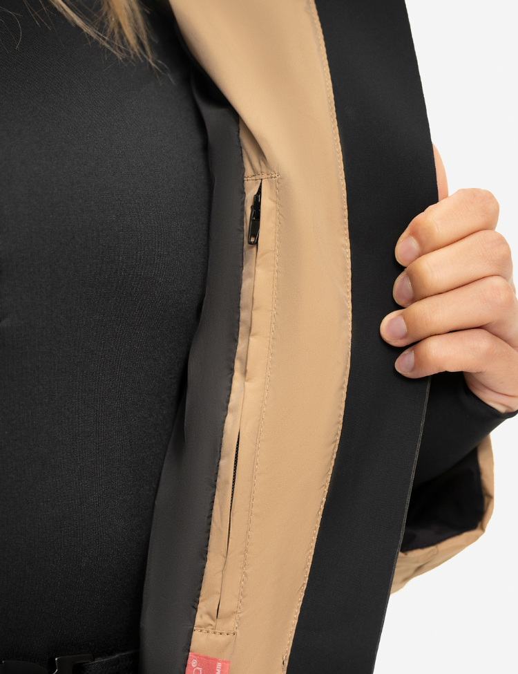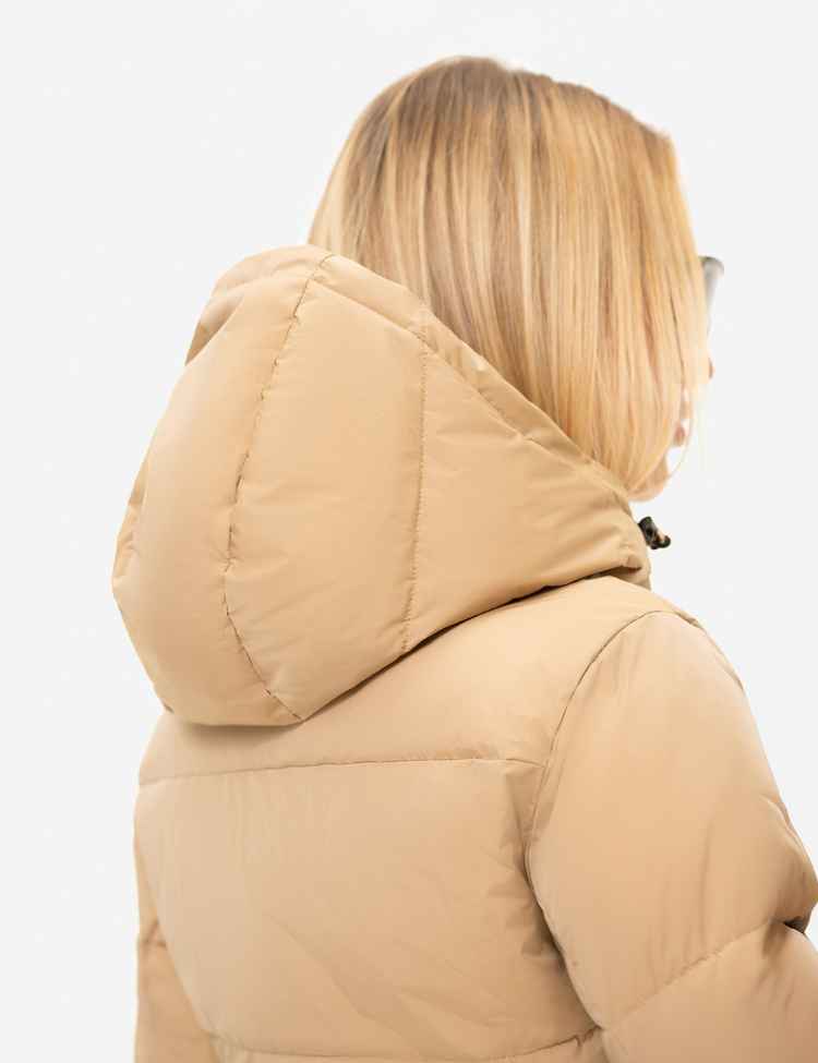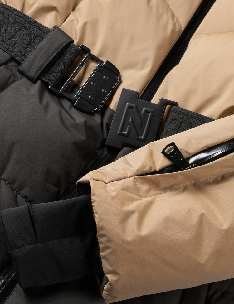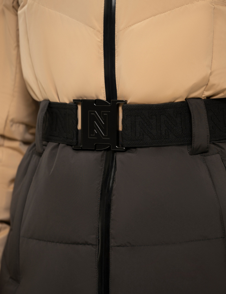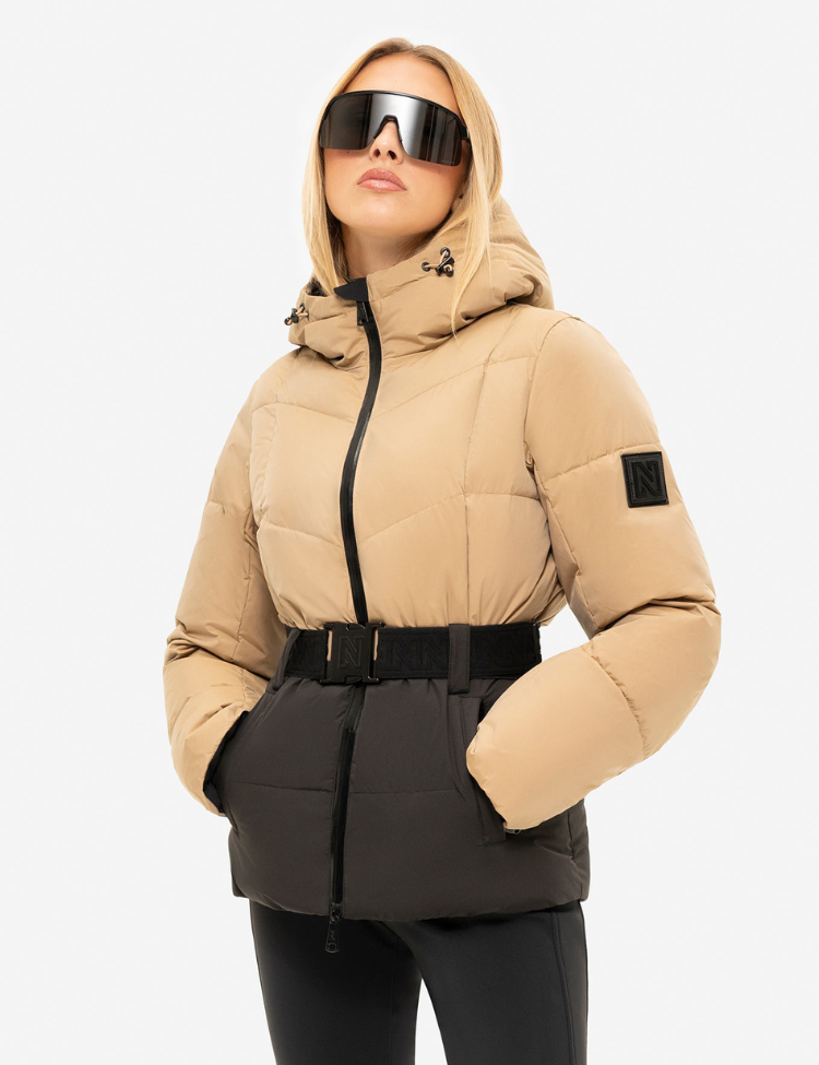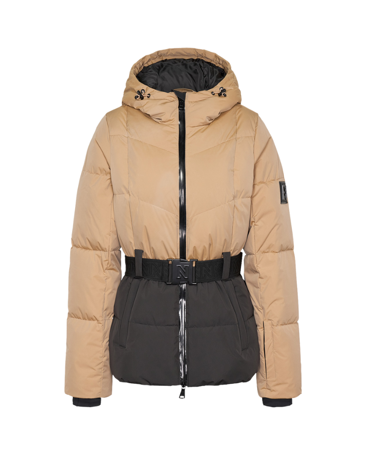 De jas is voorzien van een afneembare capuchon, een elastische tailleband met iconische NIKKIE-gesp, en glanzende zwarte ritsdetails. De warme voering en het winddichte materiaal maken deze jas ideaal voor koude dagen, zowel op wintersport als in de stad.