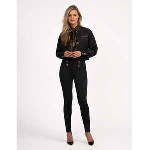 Deze zwarte tregging van Nikkie combineert het comfort van een legging met de uitstraling van een pantalon. De strakke pasvorm wordt verfraaid door zes goudkleurige knopen met het Nikkie-logo op de voorzijde, die decoratief in twee rijen zijn geplaatst. Het elastische materiaal zorgt voor bewegingsvrijheid terwijl de aansluitende pijpen je benen mooi accentueren. De hoge taille met brede tailleband geeft een flatterend silhouet. Perfect voor wie houdt van een verzorgde look met net dat beetje extra door de opvallende gouden details.