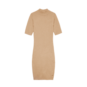 Deze gebreide jurk van Nikkie combineert een zachte wolmix met een verfijnde uitstraling. De pebble kleurige jurk heeft een hoge col en korte mouwen die tot de elleboog reiken. Het aansluitende model valt tot halverwege de kuit en accentueert je silhouet op een natuurlijke manier. De fijngebreide structuur geeft de jurk een luxe textuur, terwijl het goudkleurige Nikkie logo-plaatje op de zoom een subtiel detail vormt. Perfect als basis voor je garderobe deze winter.
