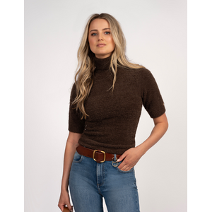 Deze bruine coltrui van Nikkie combineert zachte gebreide stof met een moderne silhouet. Het aansluitende model heeft korte mouwen met geribde boorden en een hoge col die je halslijn elegant omlijst. De fijngebreide structuur voelt comfortabel aan en behoudt perfect zijn vorm. Een goudkleurig metalen logo-plaatje met de letters 'N' siert subtiel de kraag. De getailleerde pasvorm accentueert je figuur, terwijl de geribde afwerking bij de zoom zorgt voor een verzorgde afronding.