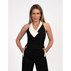 Dit zwarte mouwloze gilet van Nikkie heeft een opvallende crèmekleurige halslijn die doorloopt in een asymmetrische revers. Het getailleerde vest is voorzien van twee paspelzakken aan de voorkant en goudkleurige knopen voor een verfijnde afwerking. De halternek constructie zorgt voor een vrouwelijk silhouet, terwijl de structured pasvorm je taille mooi accentueert.