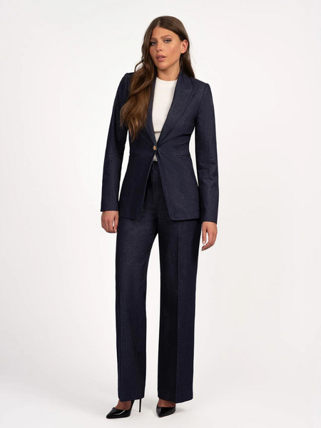 Deze denim set van Nikkie bestaat uit een getailleerde blazer en bijpassende wijde broek. De blazer heeft een reverskraag, één goudkleurige knoop en twee klepzakken aan de voorzijde. Het jasje valt net over de heup. De broek heeft een hoge taille met zijdelingse sluiting en loopt wijd uit naar beneden. Beide items zijn uitgevoerd in een donkerblauwe denimstof met subtiele structuur. De combinatie van getailleerde blazer en ruimvallende broek creëert een modern silhouet.