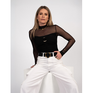 Deze elegante zwarte mesh top van Nikkie staat prachtig op een witte pantalon met wijde pijpen. De combinatie creëert een stijlvol contrast tussen het aansluitende bovenlijf en de ruimvallende broek. Gouden accessoires zoals de halsketting en oorhangers versterken het luxe karakter van je outfit.