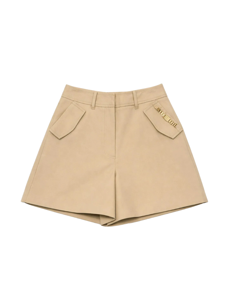 Deze short in travertine beige heeft een hoge taille en wijde pijpen. De voorkant heeft twee aangezette paspelzakken met klepjes en een goudkleurige tekst op de rechterzak. De tailleband heeft een verborgen haak- en ritsluiting. De short is gemaakt van een soepele, stevige kwaliteitsstof die zijn vorm behoudt. Een mooi middellang model dat net boven de knie valt.
